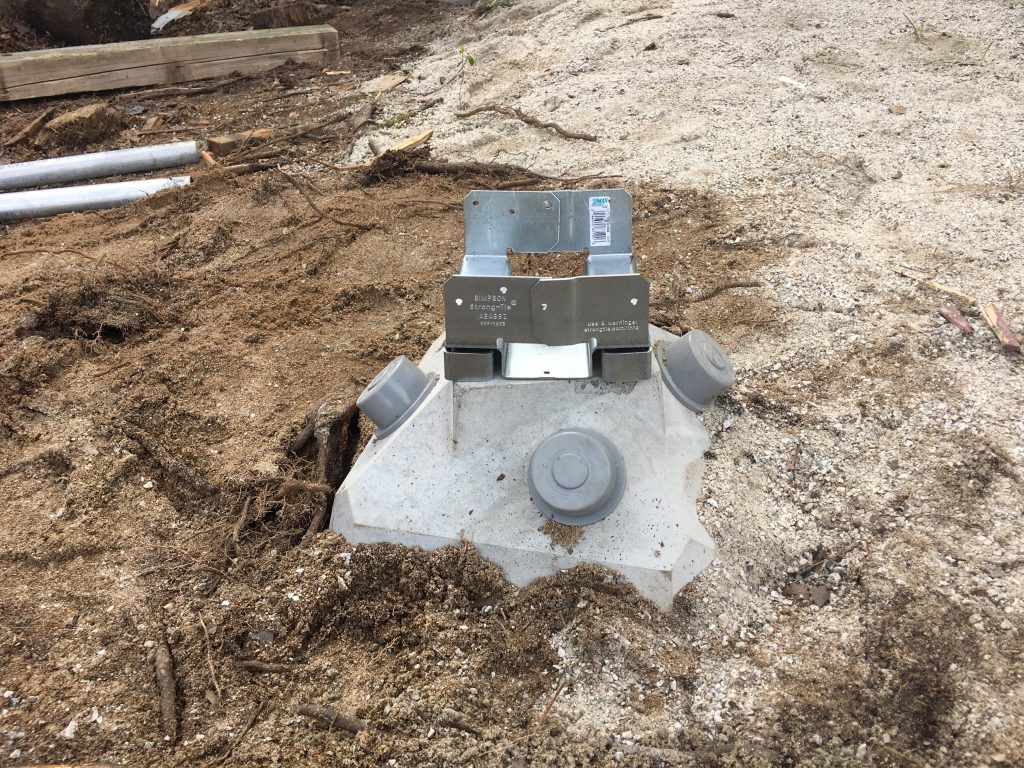 - Đào một lỗ hình vuông thon có kích thước và hình dạng tương tự như nửa dưới của móng kim cương. Điều này tạo ra một cái nôi để ổn định đầu móng cân bằng. Thực hiện theo các quy trình, cẩn thận nhấc phần đầu móng bê tông lên và đặt nó vào lỗ của nó.* Đảm bảo phần đầu bằng phẳng và chính giữa theo hướng thẳng hàng. (có thể chôn móng sâu hơn 1/2 thân móng). Đầm nhẹ để duy trì mức độ và sự thẳng hàng trong quá trình đóng chốt. Có thể sử dụng sỏi, đá tròn nhỏ gia cố nếu có sẵn tại địa phương.